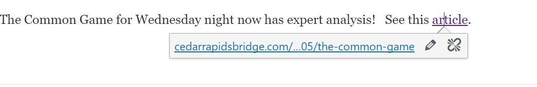 Step 5: If the link doesn’t work, reopen the editor and click on the link text. This will open a little tab that lets you correct or delete the link (Figure 5). Click the pencil symbol and make your changes to the URL. Click “apply”. “Update” the post, and then retest as needed.
