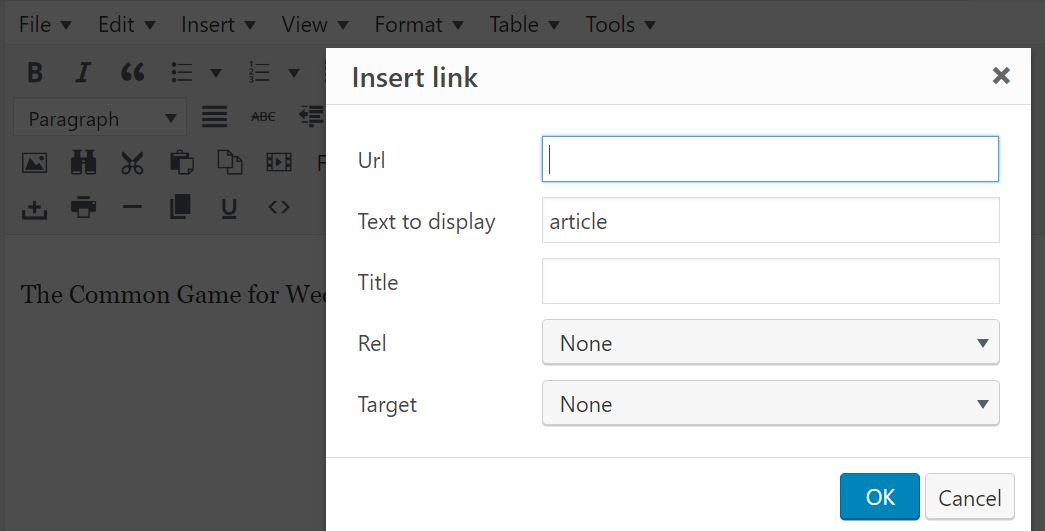 Step 2: Paste or type the desired web address (“URL”) in the corresponding window. If you want a new tab to open when the link is clicked, select “New Window” in the target dropdown. See Figures 2 and 3. Click OK. An easy way to get the URL you want is to open the target item in a separate tab and then to select and copy and paste what you see in the browser’s address window.
